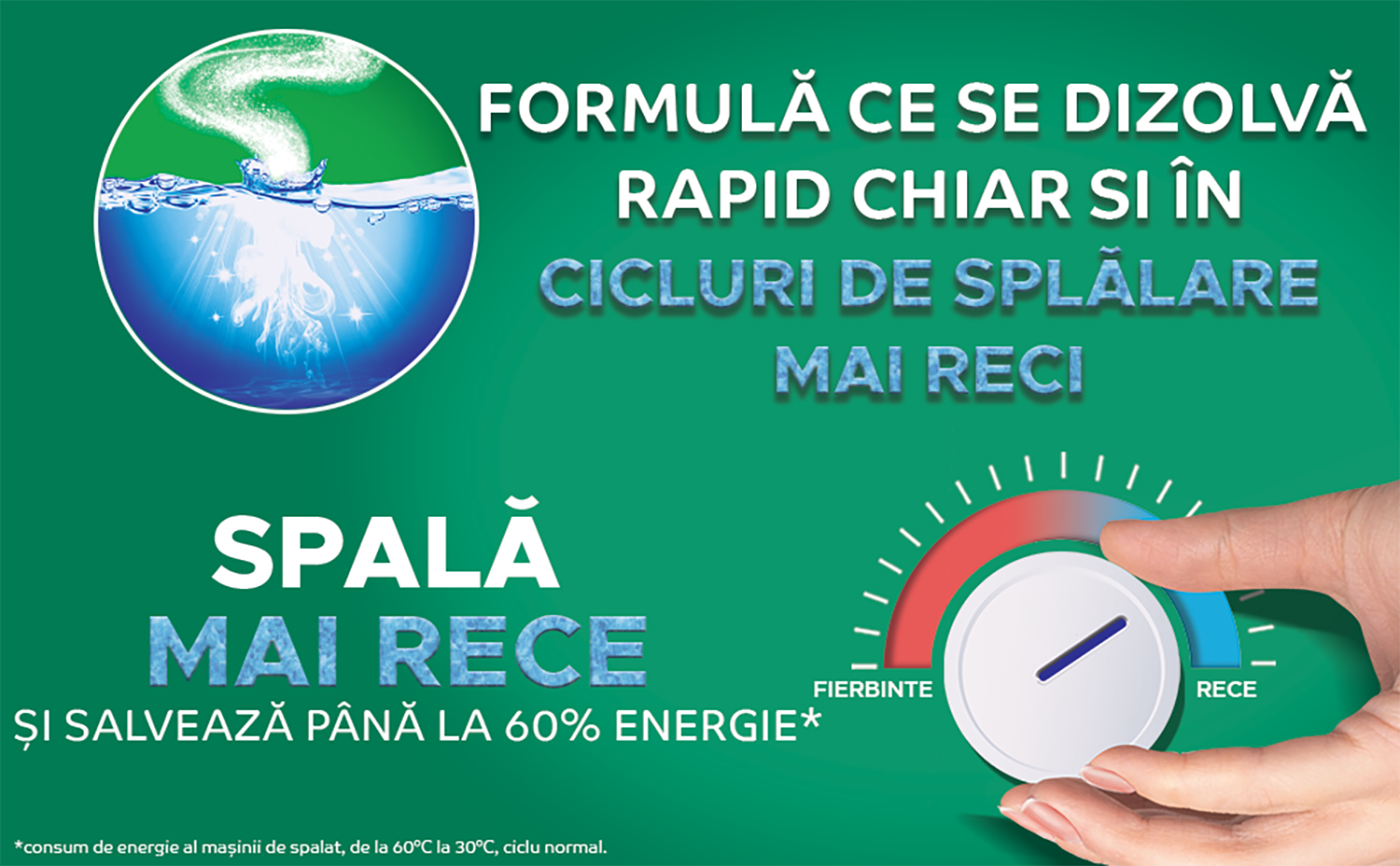 Reduceti temperatura de spalare la 30°C si economisiti pana la 60% din consumul de energie electrica*. (*Consumul de energie al masinii de spalat, de la 60°C la 30°C, ciclu normal). Ciclurile de spalare in apa rece ajuta la protejarea materialelor pentru o perioada mai lunga de timp, comparativ cu ciclurile de spalare in apa calda.