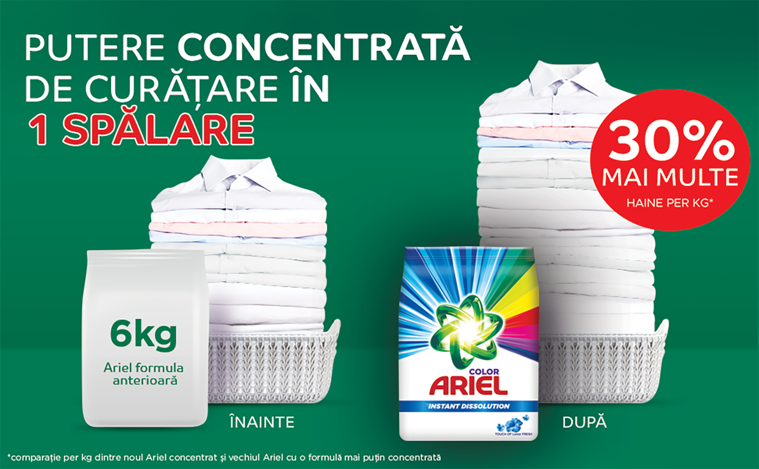 Acum, cu formula sa concentrata, Ariel ofera o putere de curatare mai mare si spala mai multe rufe per kilogram.