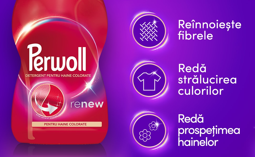 - Îngrijire potrivită pentru haine colorate: detergentul lichid Perwoll Color curăță blând hainele, reînnoiește fibrele și redă strălucirea culorilor