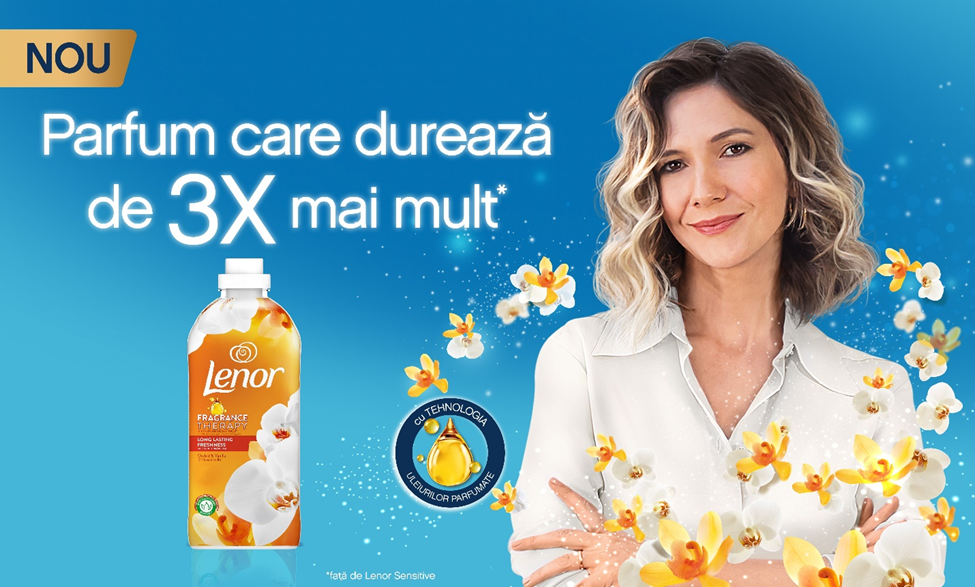 Balsamul de rufe Lenor Orchid & Vanilla cu note pretioase de orhidee si vanilie are un parfum care dureaza de 3 ori mai mult*. *vs Lenor Sensitive |