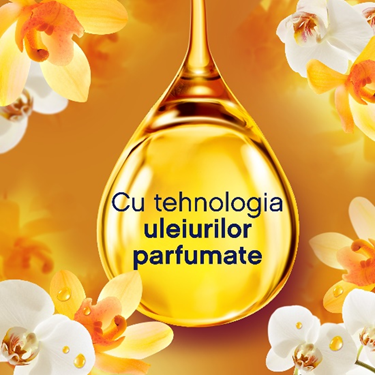 Cu tehnologia uleiului de parfumate pentru un parfum care dureaza de 3 ori mai mult*. Inchide ochii si relaxeaza-te. Notele pretioase de orhidee se imbina perfect cu notele de gurmande de vanilie si creeaza un parfum cald care te poate ajuta sa te relaxezi. *vs Lenor Sensitive |