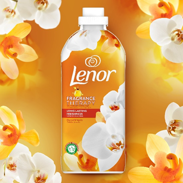 Balsamul de rufe Lenor Orchid & Vanilla cu note pretioase de orhidee si vanilie are un parfum care dureaza de 3 ori mai mult*. *vs Lenor Sensitive |
