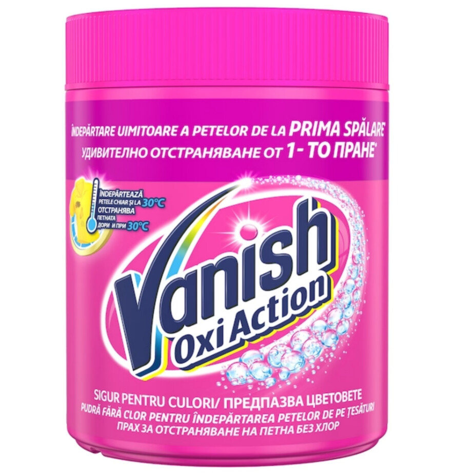 Vanish Pink Oxi Action pudra indeparteaza de la pete dificile, pe care le puteti observa cu usurinta, pana la cele mai mici pete pe care este posibil sa nu le observati inainte de spalare